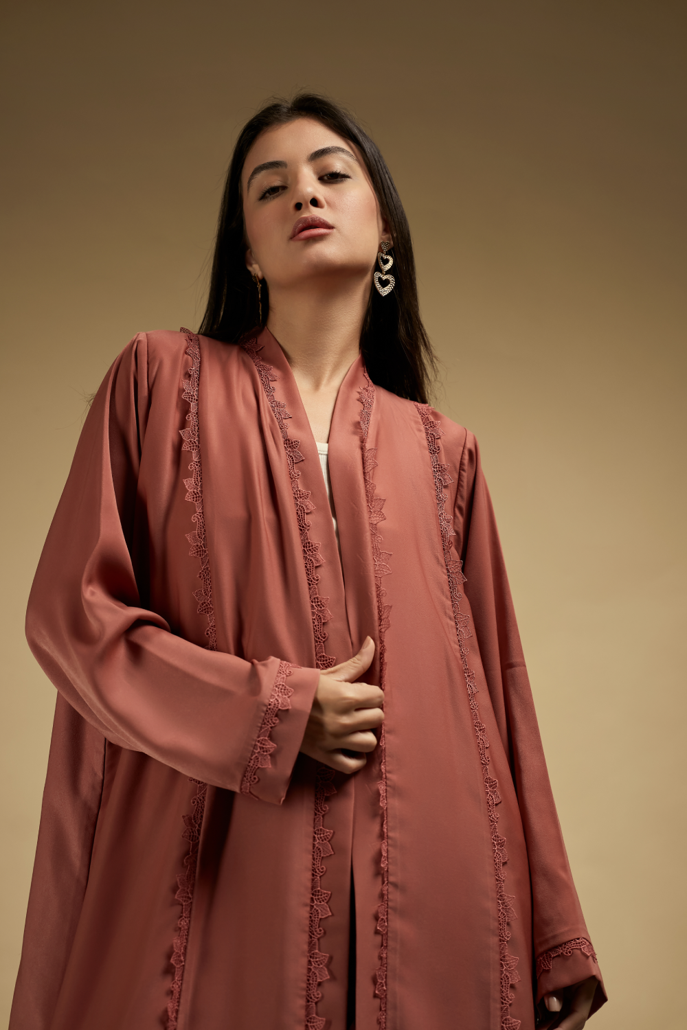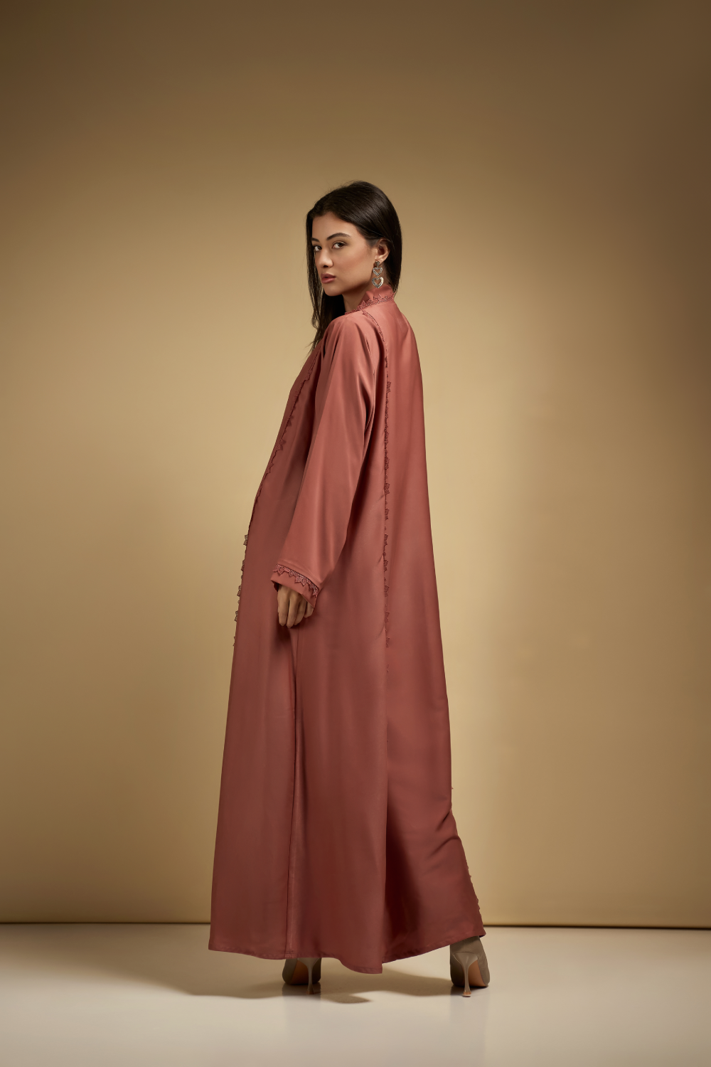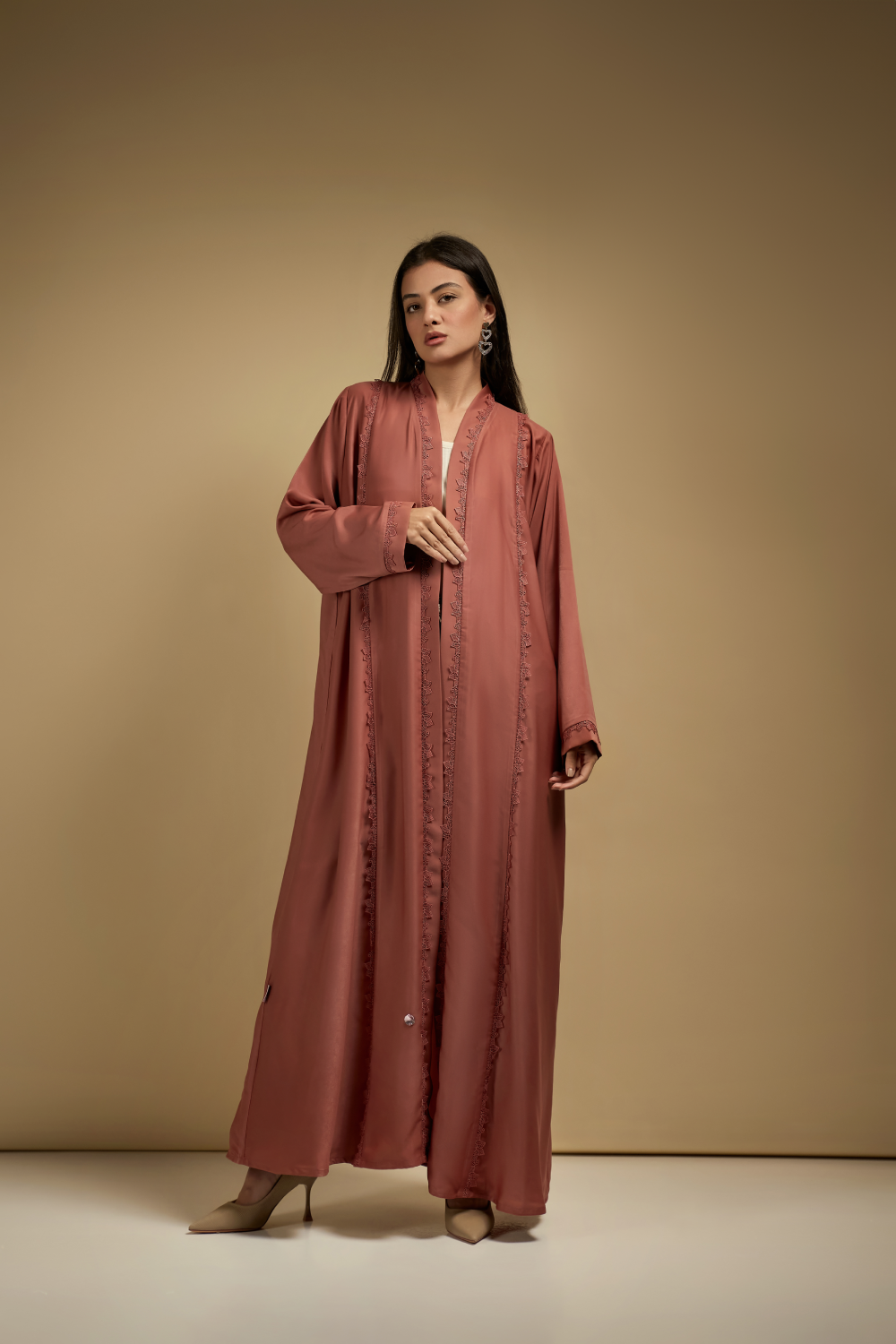 The model’s height 173 CM wearing M size abaya [Armhole: 9, Bust circumference: 22, Full length: 56].